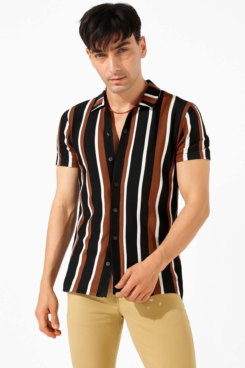Step into standout style with our Men’s Bold Stripe Cuban Collar Shirt, a modern essential for the fashion-forward man. Featuring a striking vertical stripe pattern in black, brown, and white, this shirt blends retro charm with contemporary edge—perfect for casual outings, date nights, or upscale streetwear looks.